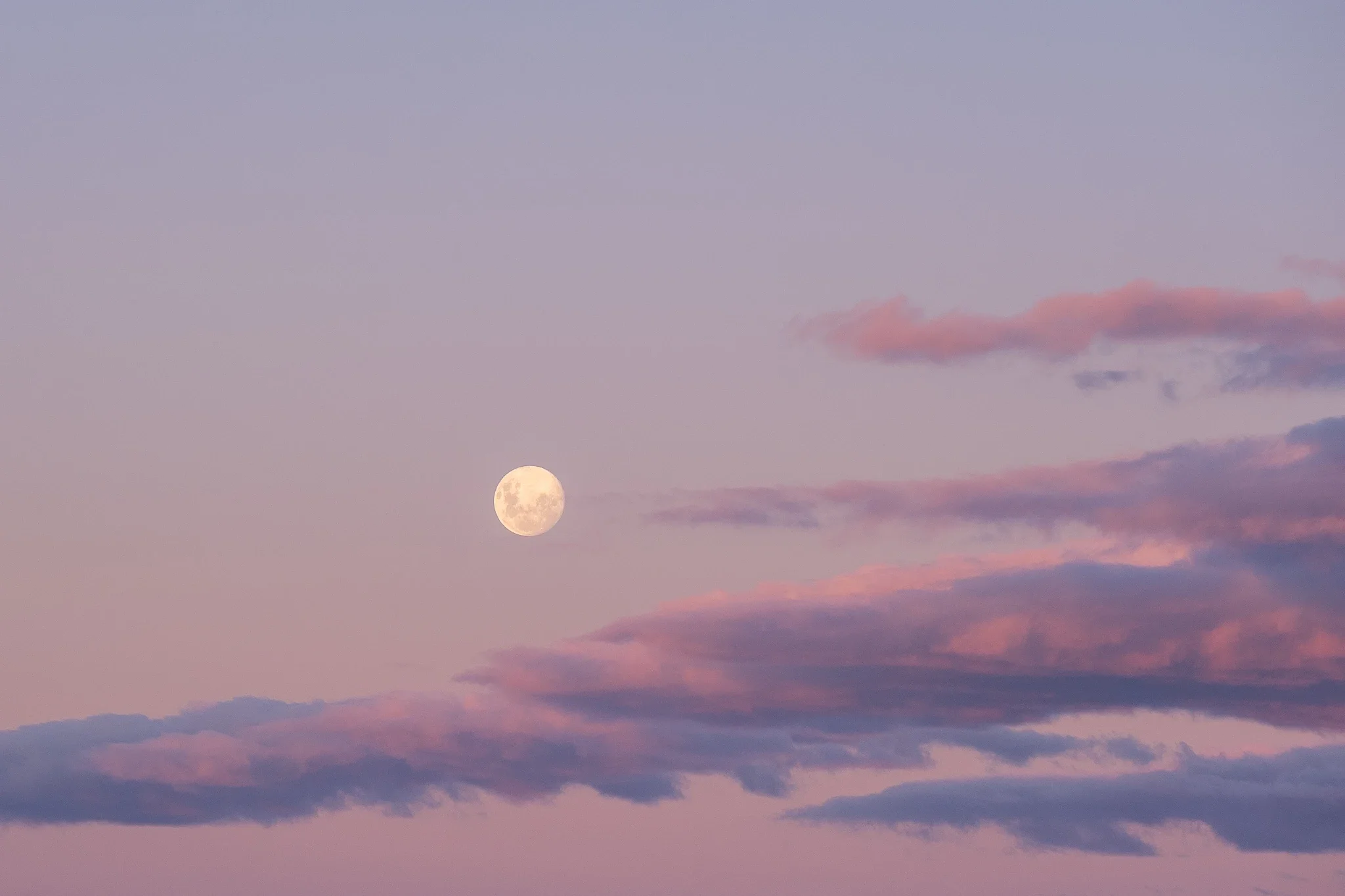 Supermoon rising at sunset with pastel pink and purple clouds glowing like candyfloss across the sky.