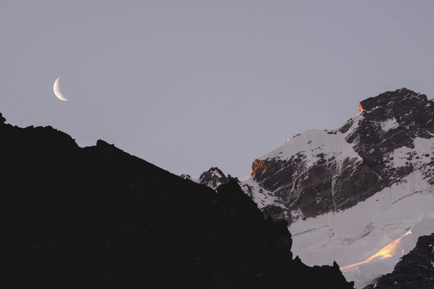 Crescent moon setting above rugged mountain ridges and snow-covered peaks in Aoraki Mount Cook National Park, New Zealand, with the first light of dawn touching the summits.