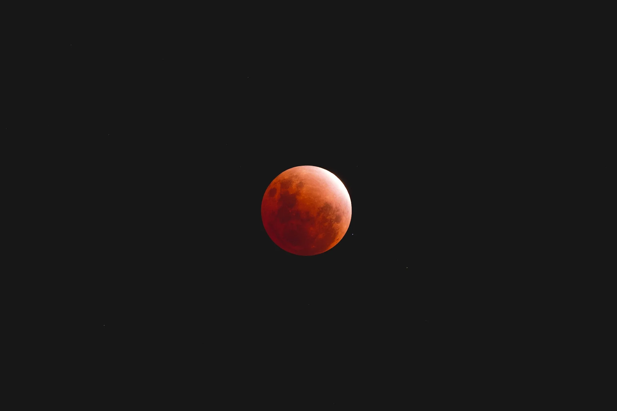 Total lunar eclipse at totality during a micromoon in New Zealand, showing the moon glowing deep red against a black night sky.